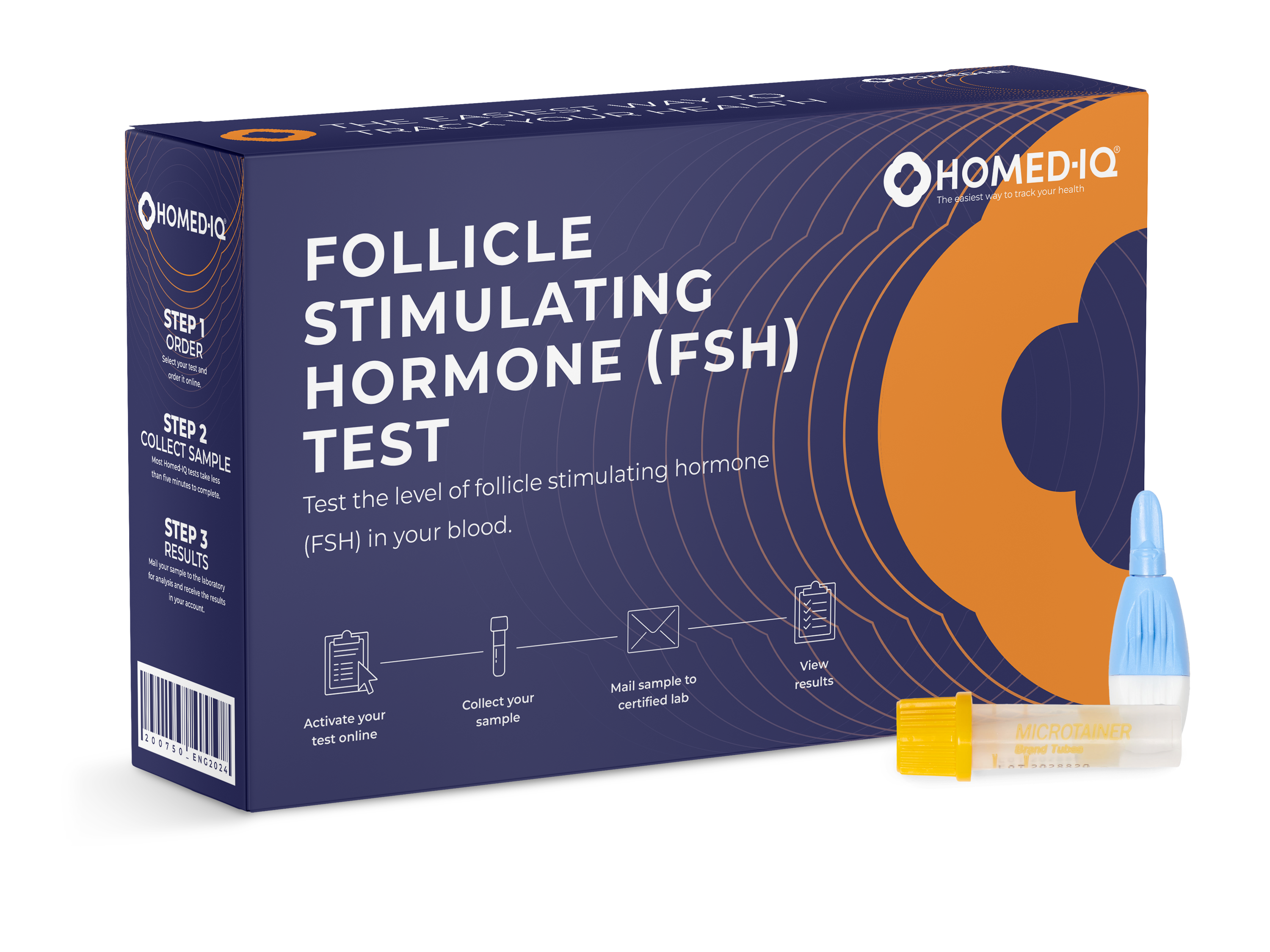 Follikel Stimulerend Hormoon (FSH) speelt een belangrijke rol bij de eisprong en de menstruatiecyclus. Een te hoog of te laag FSH-gehalte kan vruchtbaarheidsproblemen veroorzaken en wijzen op problemen met de eierstokken of de klieren die hormonen produceren in het lichaam. Deze test meet het FSH-gehalte in je bloed. Gebruik deze thuistest om meer te weten te komen over je reproductieve gezondheid of om te controleren op hormonale onevenwichtigheden die ongewenste symptomen kunnen veroorzaken.