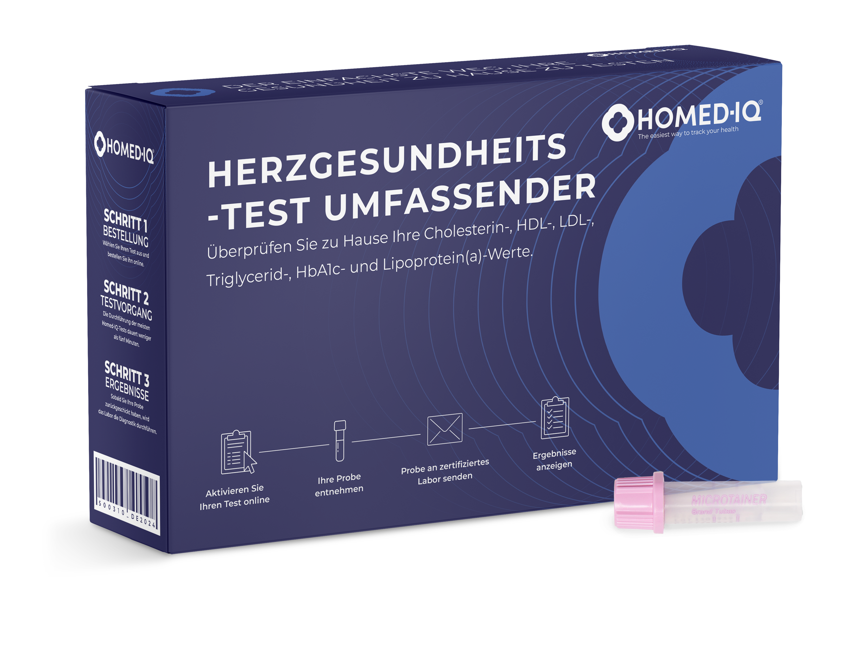 De testkit bevat gebruiksaanwijzingen, lancetten om een klein bloedmonster af te nemen, bloedafnamebuisjes, alcoholdoekjes, pleisters, een beschermende transporttas en een retourenvelop om uw monster naar een gecertificeerd laboratorium te sturen.