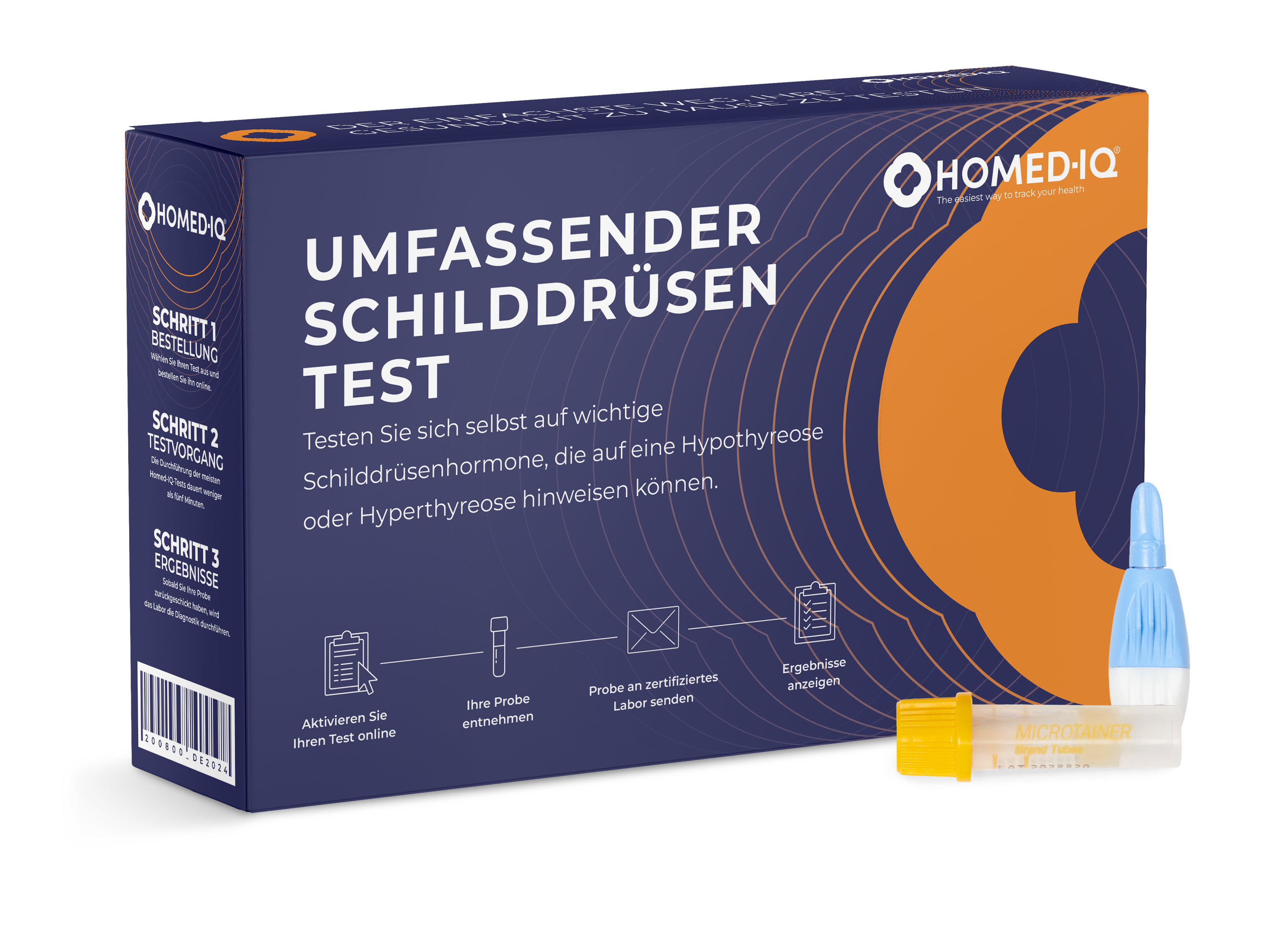 De Schildklier Bloedtest van Homed-IQ wordt geleverd met alles wat je nodig hebt om thuis een bloedmonster te nemen. Je hoeft alleen maar de test te activeren en de instructies in de testkit te volgen om een bloedmonster te nemen. Vervolgens stuur je de test met het bijgeleverde verzendlabel naar ons laboratorium. De testresultaten zijn binnen enkele dagen beschikbaar. Je testkit bevat de volgende onderdelen: